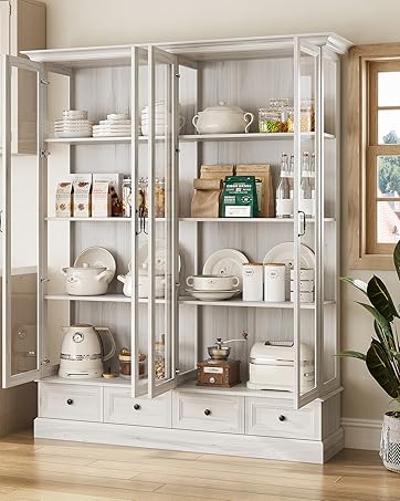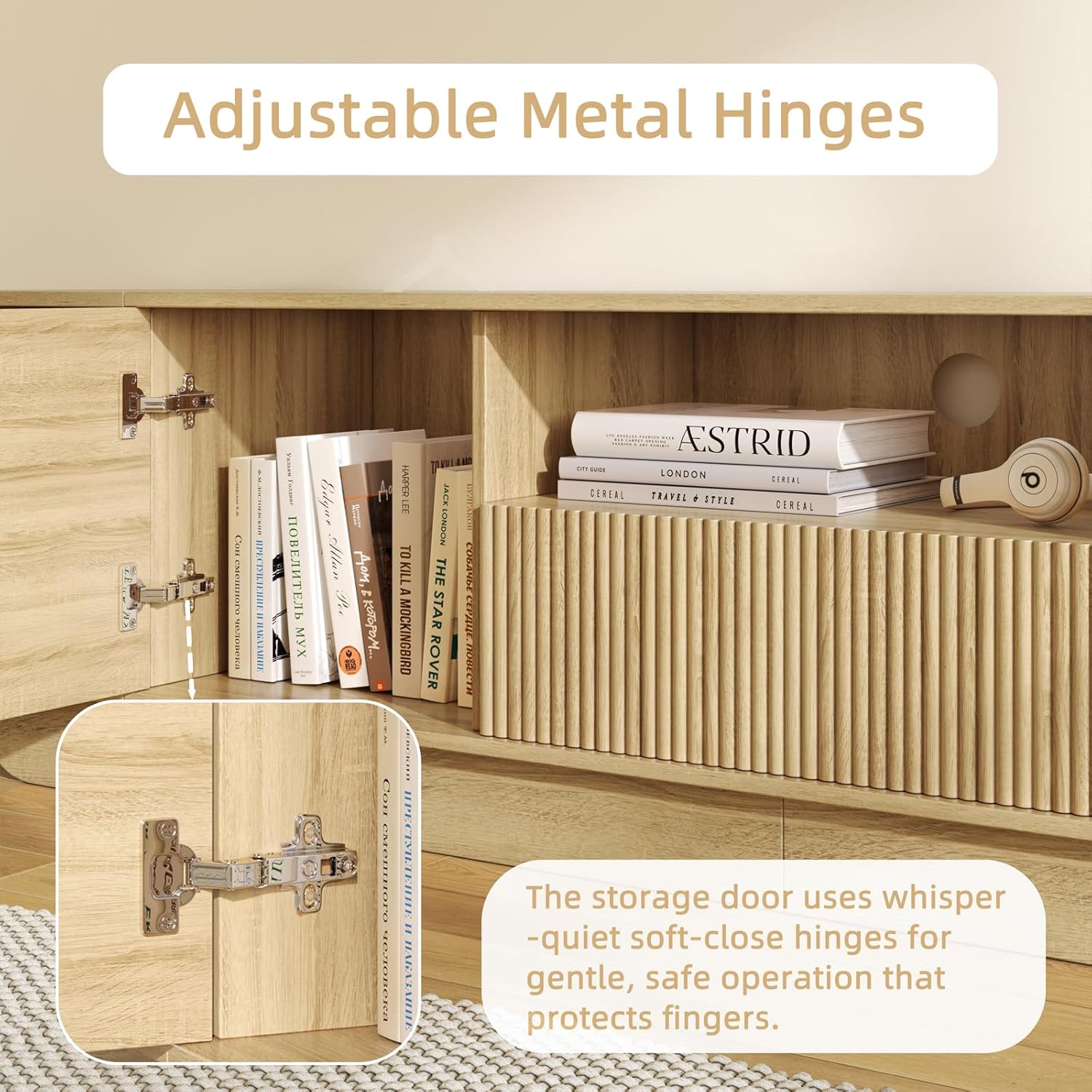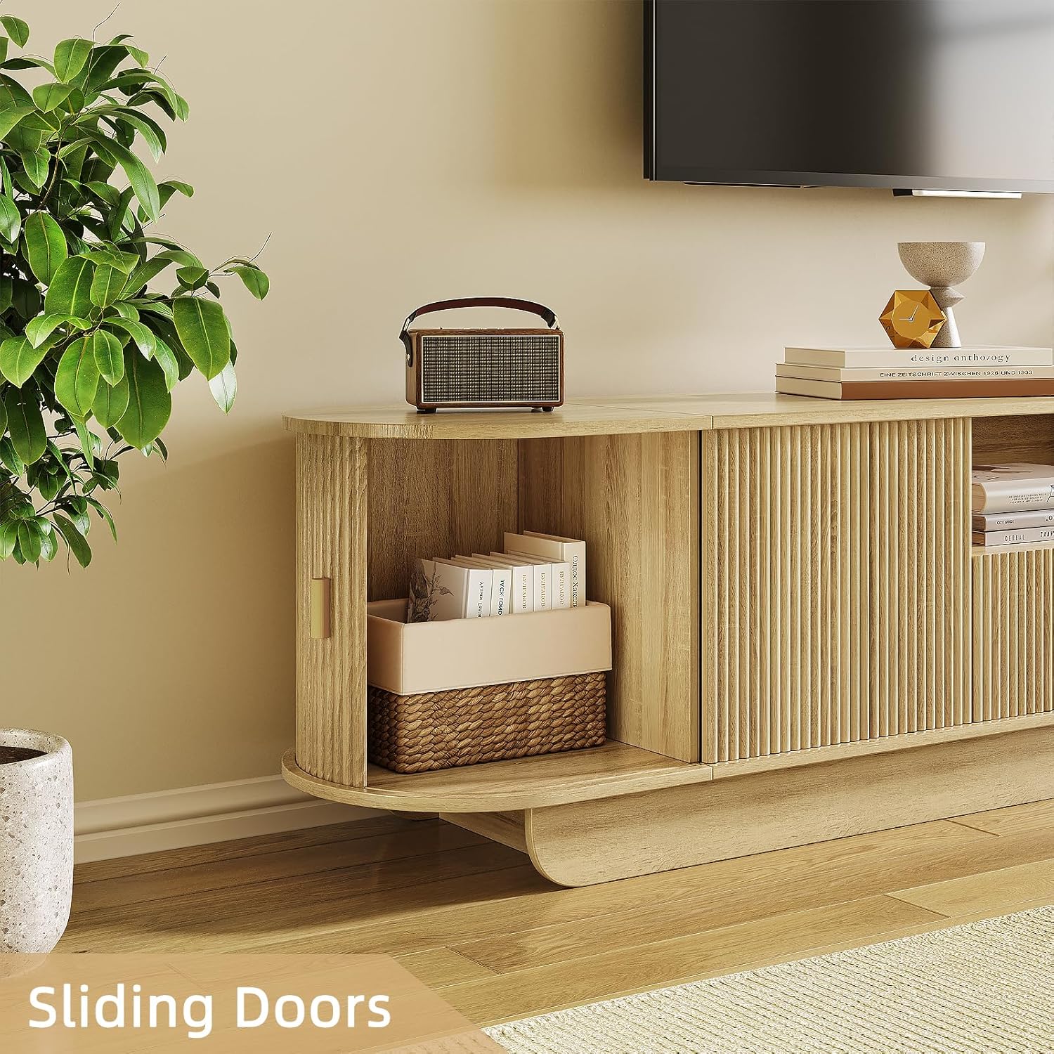 86.61'' Tambour TV Stand for 55-85 Inch, Modern Entertainment Center with Large Storage Cabinet & Open Shelves, TV Console with Sliding Doors for Living Room, Bedroom, Natural