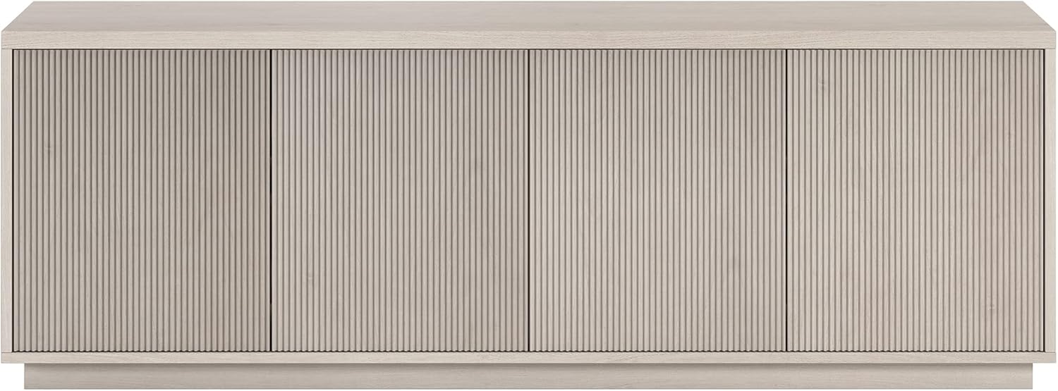 On-trend texture and design combine in this transitional TV stand. With a wood grain finish and textured doors, this piece is sure to be a statement in your living room, den, or game room. The plinth base gives an illusion of a seamless transition from your floor, as if it was always meant to be there. The modern contemporary design of the stand features 4 fully enclosed doors with 4 inner shelves, allowing for ample storage for your devices, games, books, and more.