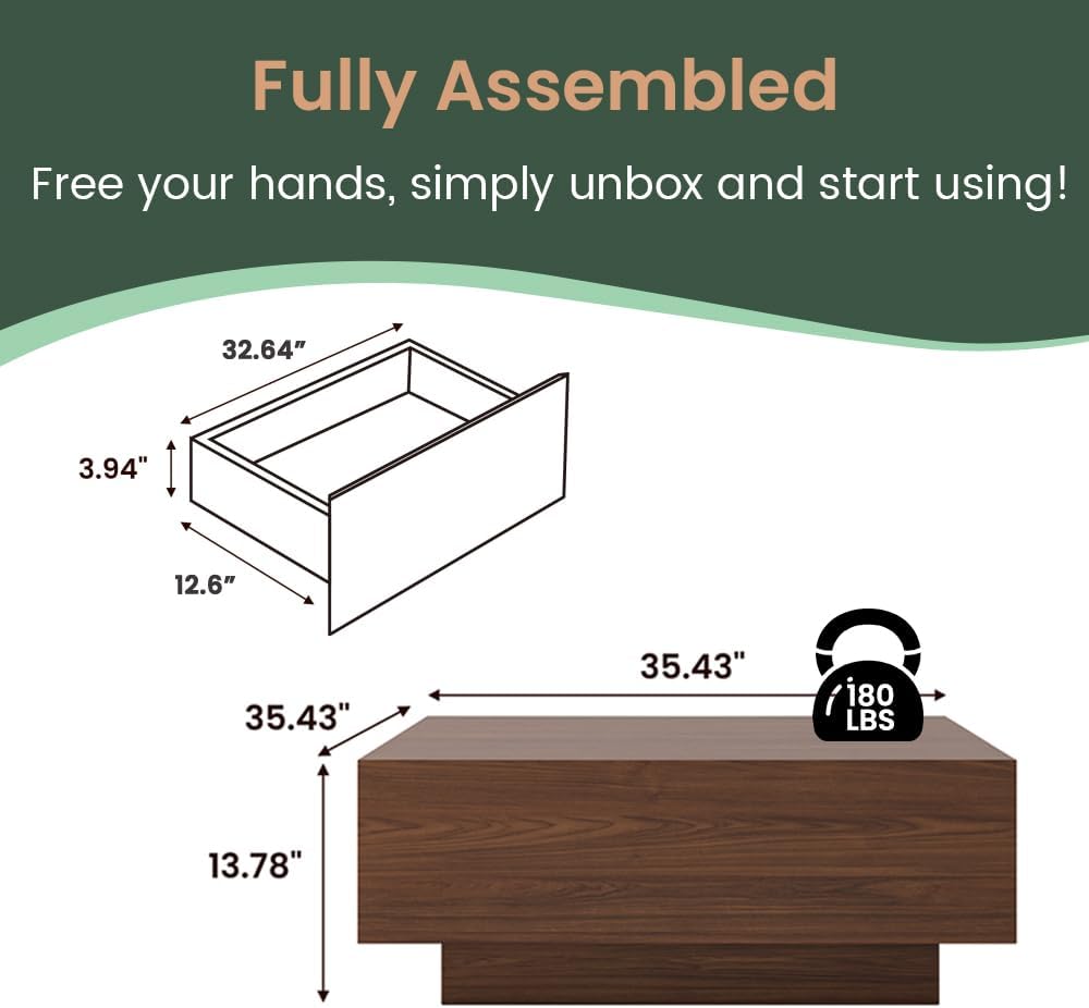 POVISON Modern Square Coffee Table with Storage, 35.43" Wood Coffee Table for Living Room Table Walnut, Fully Assembled