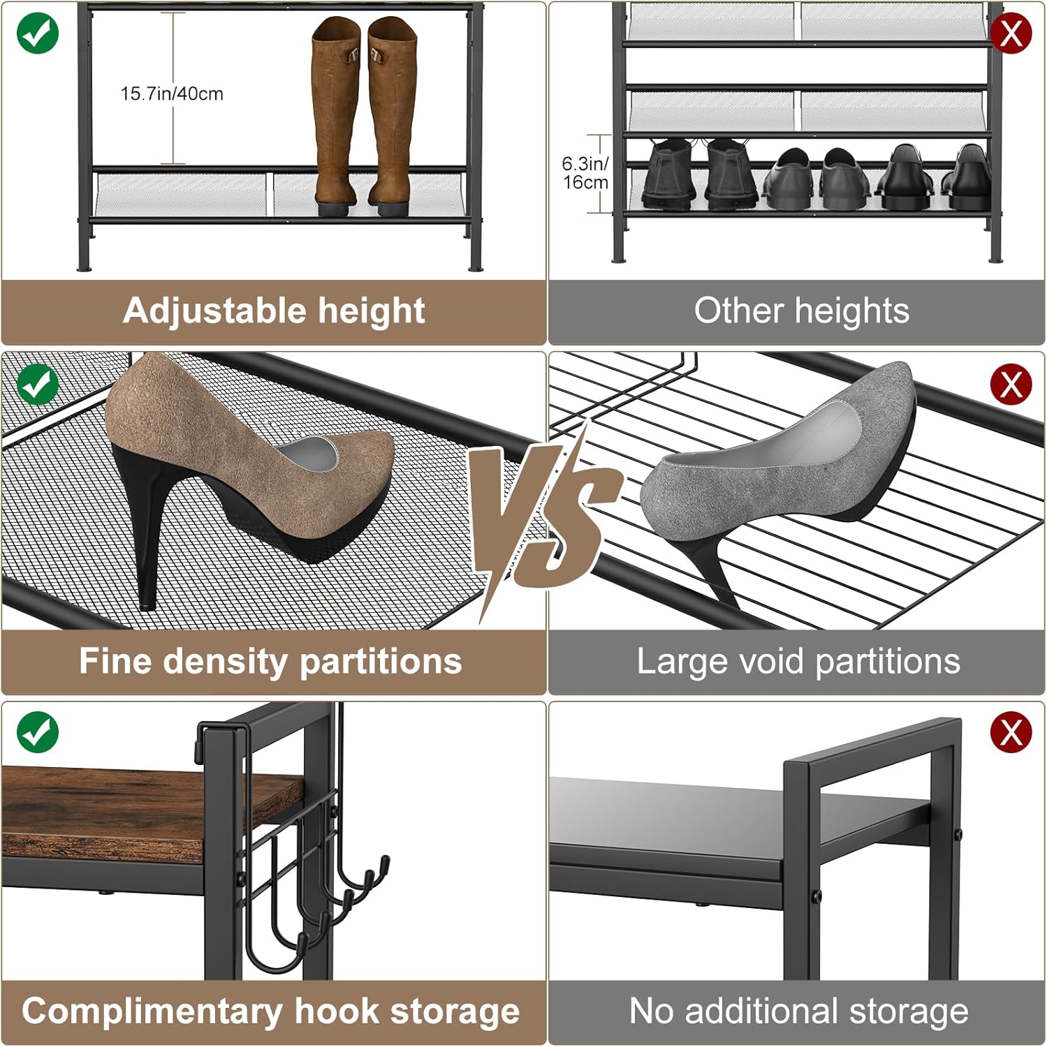Refrze Shoe Rack for Front Door Entrance, 4 Tier Height-Adjustable Metal Shoe Rack, Sturdy Wooden Top and Tiltable Steel Frame Heavy Duty Shoe Organizer for Bathroom,Bedroom,Kitchen,Include Hook