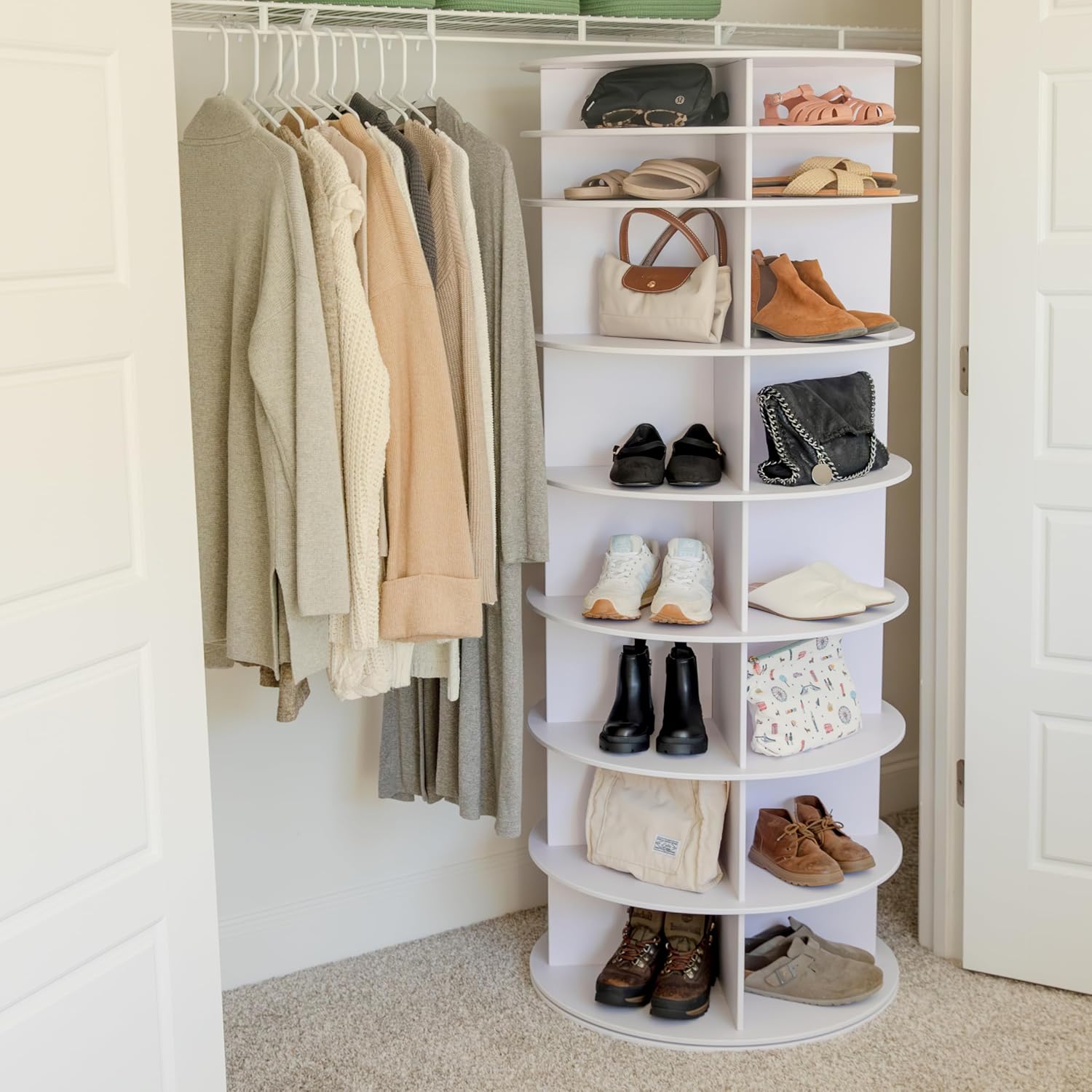 Rotating Shoe Rack Tower 360-32 Pair, 8 Tiers, Reachable Spinning Shoe Rack Tower. Rotating Storage Tower, Bookshelf, Handbag Holder (8 Tier Standard Size) 5ft, 3in.